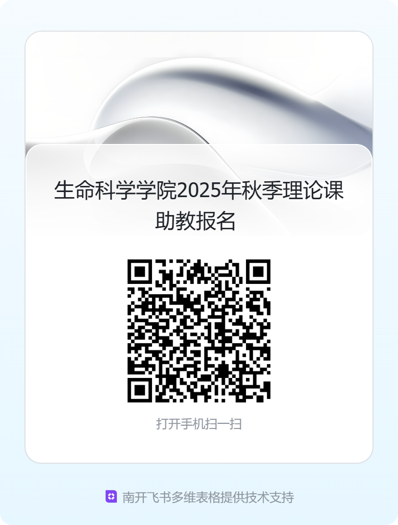 应聘助教岗位的同学必须能随堂听课并参加课程全部教学活动,且符合表格内的岗位各项要求,请有意应聘助教岗位的同学,飞书联系课程主讲教师咨询,确认报名的同学,请飞书扫描下方二维码填写问卷报名,报名时间是9月12日13:00-9月15日13:00,报名结束后,学院和任课教师将开展遴选工作。