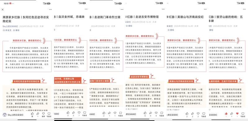 活动期间,同学们积极响应号召,主动立足家乡红色资源,分赴全国各地的红色教育基地开展实地研学,用脚步丈量红色土地,用心灵感悟革命初心,用行动传承红色薪火。在山东,学子们走进东阿红色教育基地、英雄山、济南战役纪念馆,在一幅幅珍贵图片、一件件历史文物、一个个感人故事中,重温革命战争年代的峥嵘岁月,感悟革命先辈为国家独立、民族解放付出的艰辛努力;在河北,狼牙山的苍松翠柏间,同学们聆听五壮士跳崖的英雄事迹,深刻领悟“视死如归、宁死不屈”的狼牙山精神,传承不畏强敌、奋勇抗争的革命气节;在东北,哈尔滨防洪胜利纪念塔见证着军民同心、众志成城的奋斗历程,关向应故居纪念馆里,无产阶级革命家的家国情怀与革命担当深深感染着每一位同学;在华中与华南地区,周家口抗战根据地旧址、荆门革命烈士陵园、镇海口海防历史纪念馆等场所,让同学们铭记民族危亡之际的责任与担当,感悟海防线上一代代先辈的坚守与奉献,每一处红色地标都留下了青年学子追寻初心、传承精神的身影。