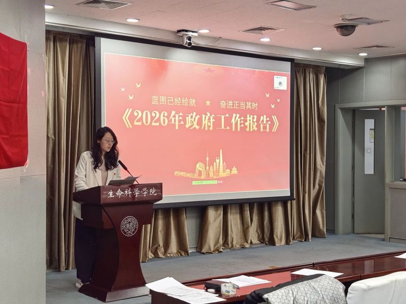 领学人赵可欣同志首先带领大家回顾了《2026年政府工作报告》的核心内容。她指出,报告充分肯定了过去一年我国在顶压前行中展现的强大经济韧性,国内生产总值增长5%,总量达到140.19万亿元,科技创新成果丰硕。她特别强调,报告将“加紧培育壮大新动能”和“加快高水平科技自立自强”列为2026年政府工作的重要任务,为生物医药等前沿领域的发展指明了方向,令在场的生科学子倍感振奋与责任重大。